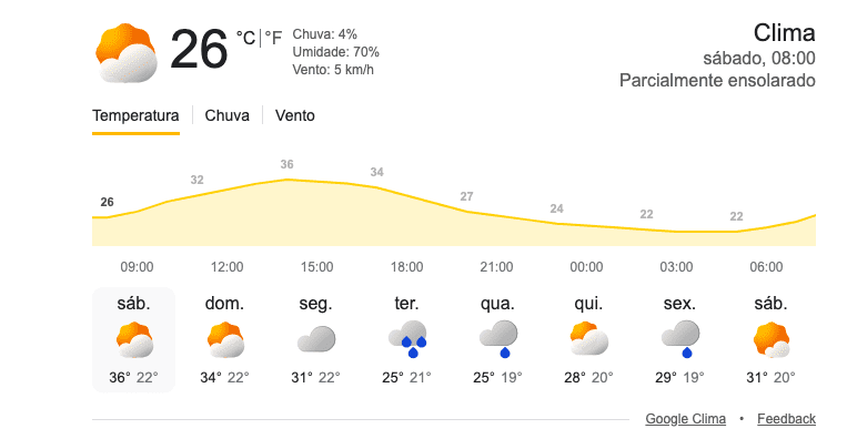 Para este sábado, a projeção indica máxima de 36°C, mas a tendência é de forte elevação ao longo do dia, com padrão semelhante no domingo. A umidade relativa do ar deve permanecer alta nas primeiras horas da manhã, reduzindo gradualmente durante a tarde, o que aumenta o desconforto térmico.