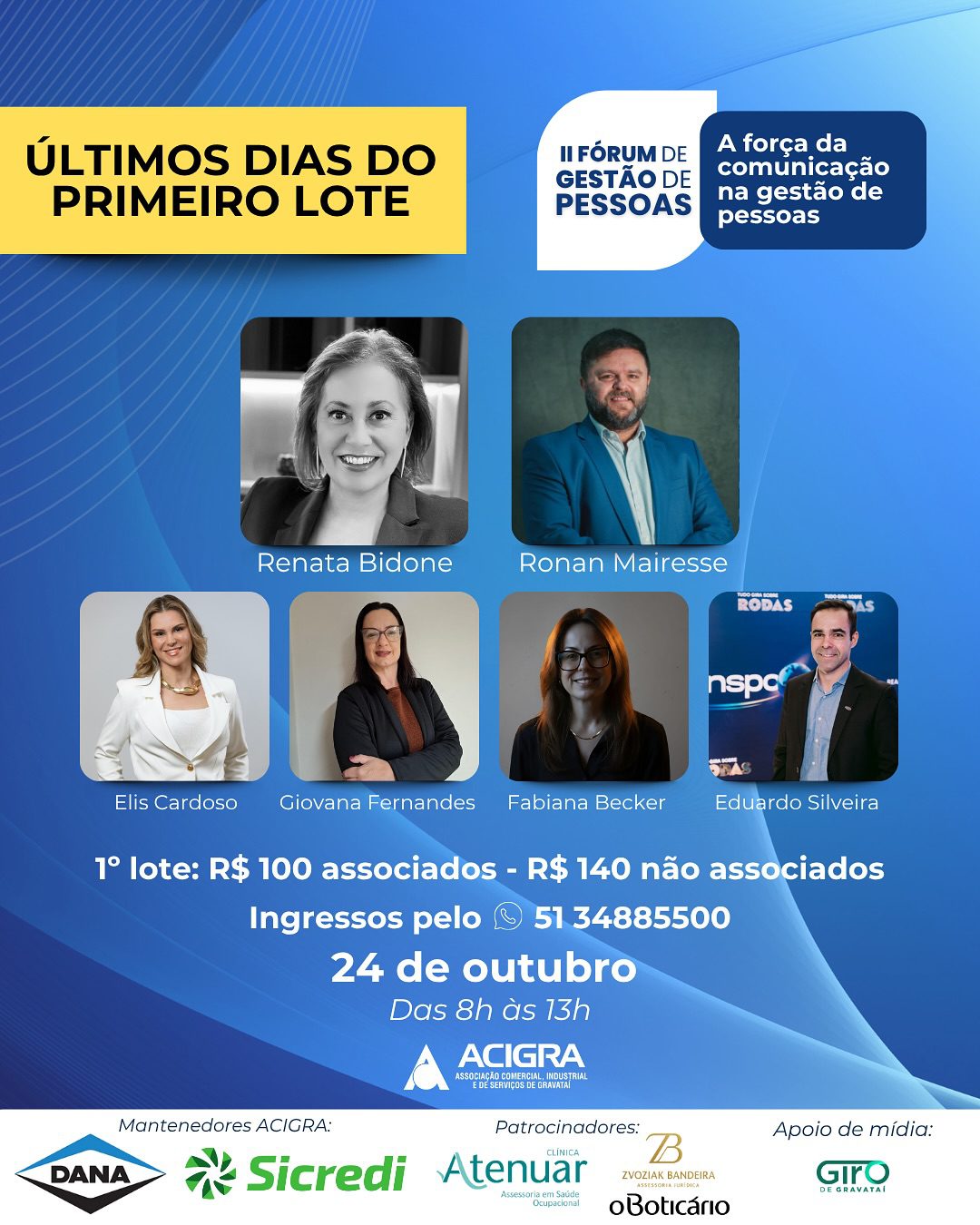 A Associação Comercial, Industrial e de Serviços de Gravataí (Acigra) divulgou os palestrantes confirmados do II Fórum de Gestão de Pessoas, que acontece no dia 24 de outubro, das 8h às 13h, com o tema “A força da comunicação na gestão de pessoas”. O encontro reunirá profissionais e empresários interessados em aprimorar práticas de liderança e estratégias de comunicação no ambiente corporativo.