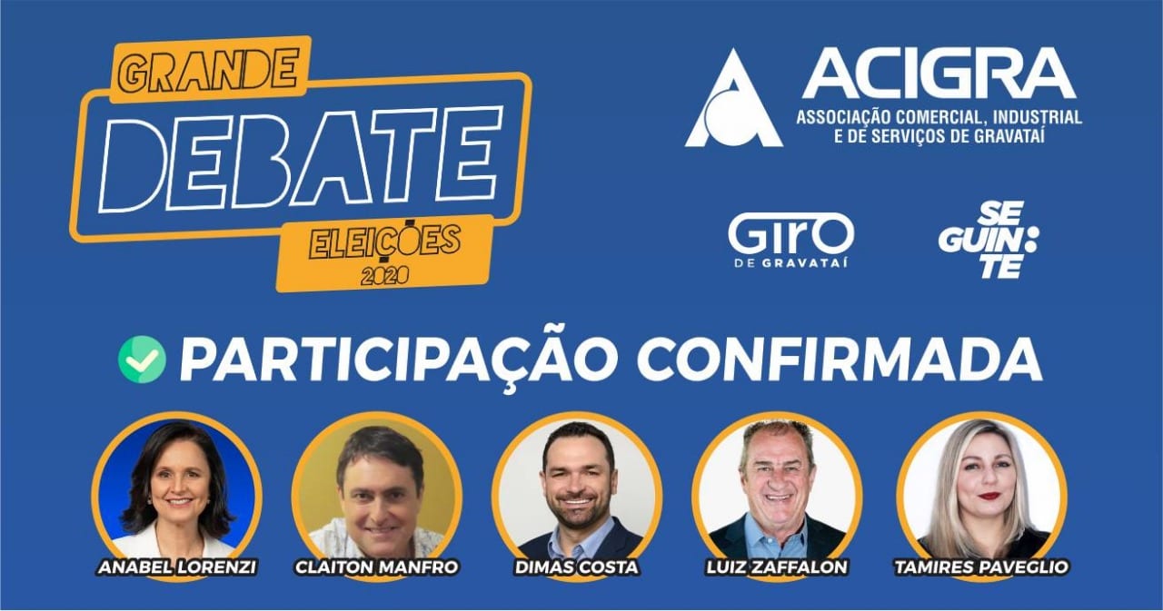 Faltando pouco dias para a eleição, o Giro de Gravataí junto com a Associação Comercial, Industrial e de Serviços de Gravataí (Acigra) transmitem o debate entre os candidatos à Prefeitura de Gravataí. Pelas páginas do Giro, do Site Seguinte e da Acigra no Facebook, o eleitor poderá conhecer melhor as propostas e ver o confronto de ideias dos postulantes ao governo do município. O debate acontece hoje (09), às 19h, com mediação do vice-presidente da Acigra, Régis Albino Marques Gomes.