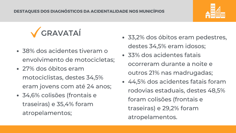 Caxias possui muitas colisões com objetos fixos, Gravataí registra a maioria dos acidentes em rodovias, Pelotas se destaca pelos acidentes com motociclistas, especialmente jovens. Em Rio Grande, o maior problema são os acidentes com pedestres idosos, e em Novo Hamburgo, os acidentes em vias municipais no turno da noite.