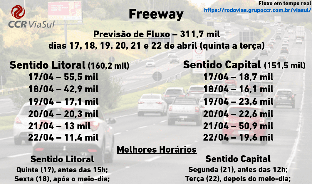 O feriadão de Páscoa e Tiradentes resultará em grande movimento na Freeway, conforme a CCR ViaSul. A previsão é de fluxo intenso entre os dias 17 e 22 de abril (quinta a terça). Conforme o levantamento da empresa, cerca de 1,1 milhão de condutores deverão utilizar alguma das quatro rodovias sob sua administração (BR-101, 386, 448 e Freeway). Somente pela Freeway são esperados pouco mais de 310 mil veículos, dos quais 160 mil seguirão em direção ao norte gaúcho, enquanto outros 151 mil em direção à região metropolitana.