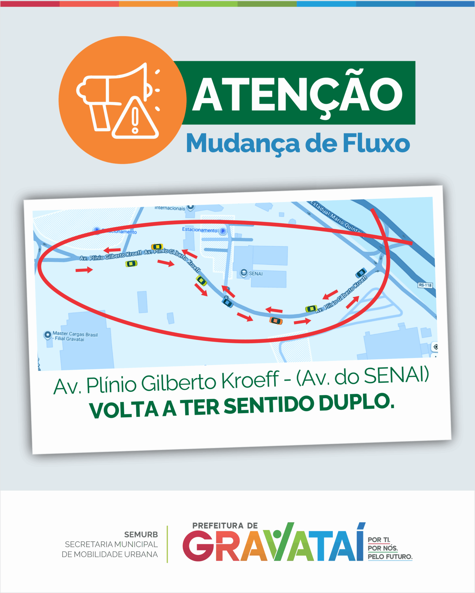 A prefeitura de Gravataí informa que a Avenida Plínio Gilberto Kroeff volta a ter duplo sentido a partir deste sábado, 6. O objetivo da alteração, segundo a Secretaria Municipal de Mobilidade Urbana (Semurb), é promover maior segurança para condutores, pedestres e estudantes que transitam pela região, em especial no trecho de acesso da ERS-118 ao Distrito Industrial de Gravataí e ao Serviço Nacional de Aprendizagem Industrial (Senai).